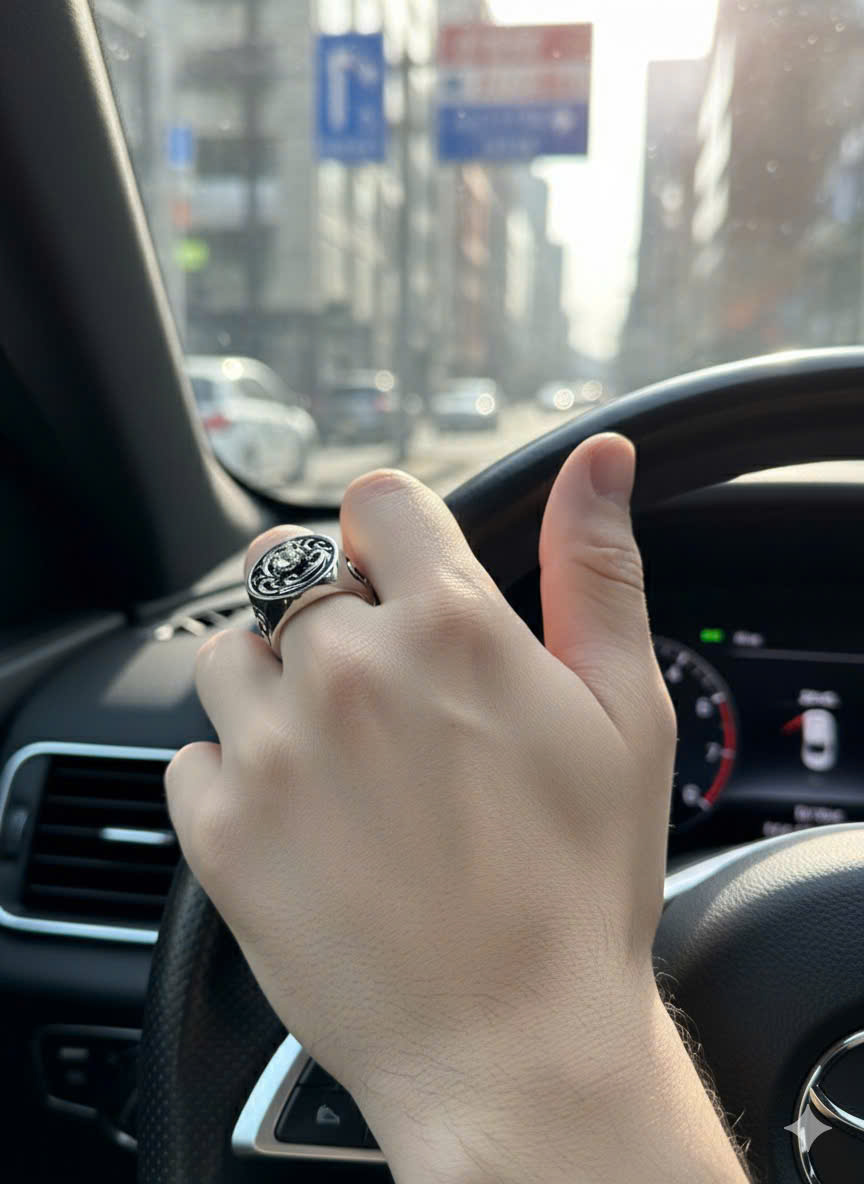 * THIẾT KẾ ĐỘC QUYỀN: Kiểu dáng Signet Ring mạnh mẽ, được nâng tầm với các họa tiết chạm khắc hoa văn cuộn xoáy (scrollwork) tinh xảo, phủ lớp men đen sang trọng, tạo nên vẻ ngoài vừa cổ điển, vừa hiện đại, đậm chất nghệ thuật và cá tính.