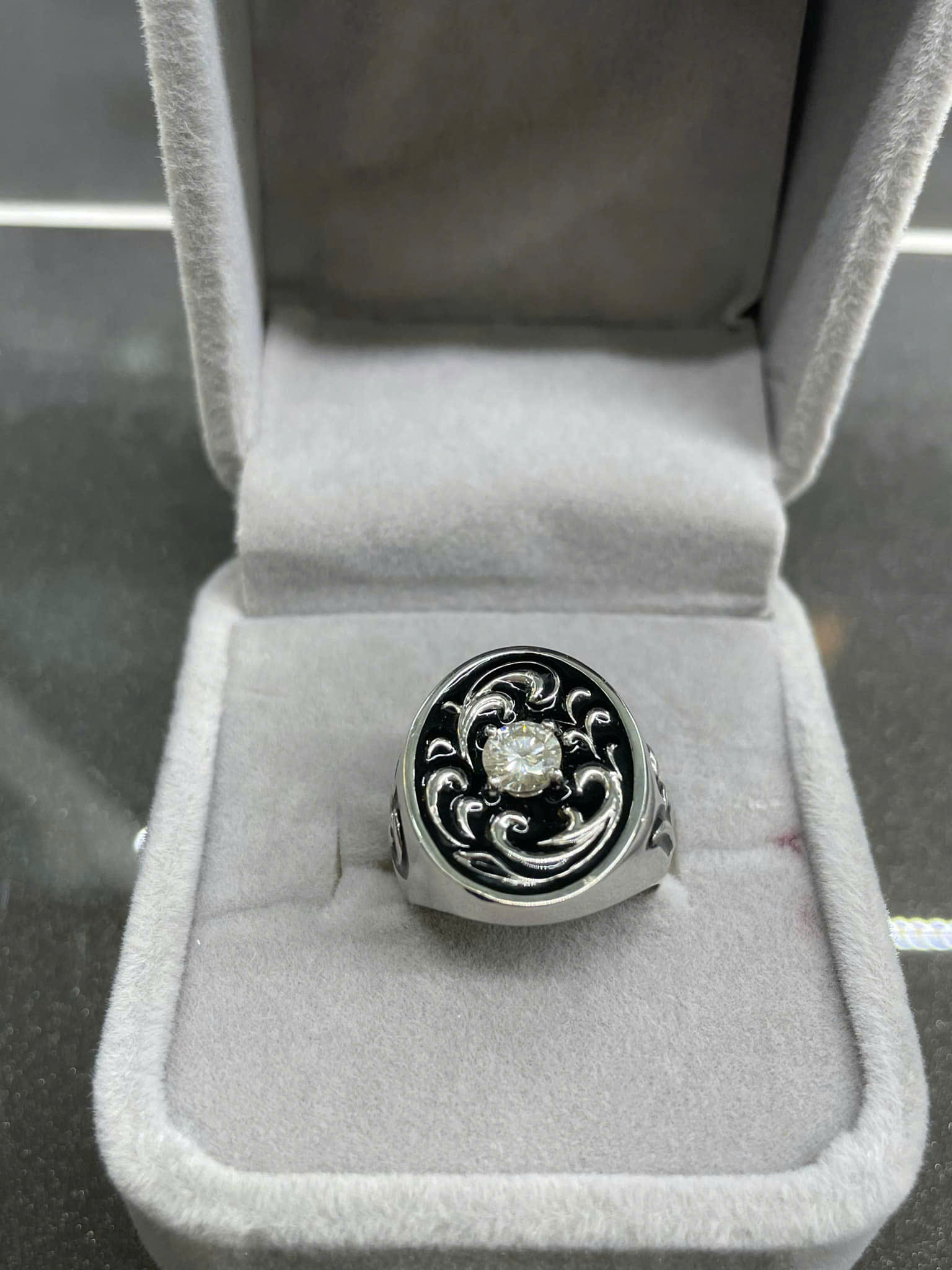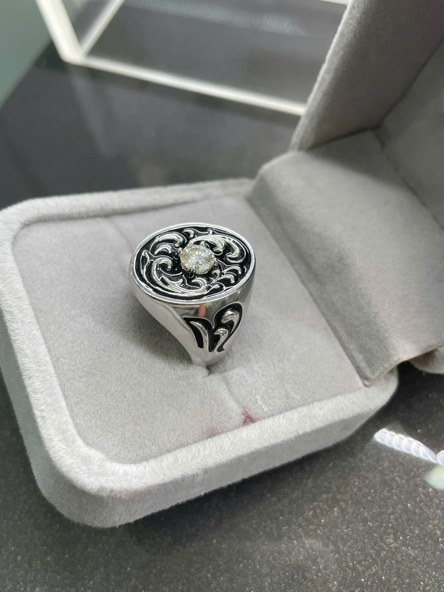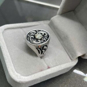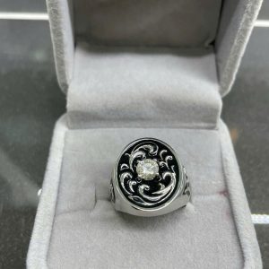 * Họa tiết chạm khắc tinh xảo: Phần mặt nhẫn và đai nhẫn được chạm khắc các họa tiết uốn lượn, xoắn ốc (phong cách cuộn xoáy Baroque, Celtic, hoặc Art Nouveau cách điệu). Các họa tiết này màu đen hoặc được làm tối (oxidized/blackened) tương phản nổi bật trên nền kim loại sáng, tạo độ sâu và nét bí ẩn, cổ điển.